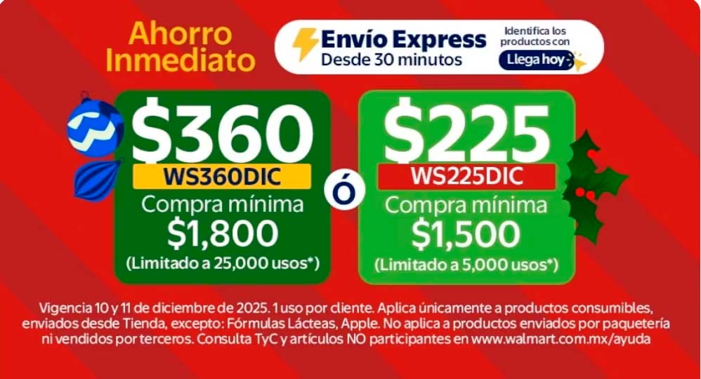 La tienda en línea Walmart Super para esta temporada de navidad te ofrece cupones de descuento haciendo una compra mínima, acontinuación te los comparto para que ahorres un pesos por tus compras:
