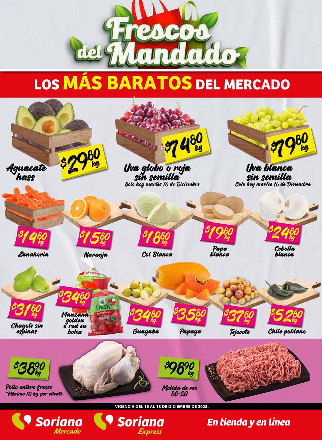 Las tiendas Soriana Mercado y Express en su Folleto Los Frescos del Mandado puedes encontrar las siguientes ofertas en frutas y verduras válidas del 16 al 18 de diciembre 2025, en el que encontrarás precios especiales que aplican en productos seleccionados.