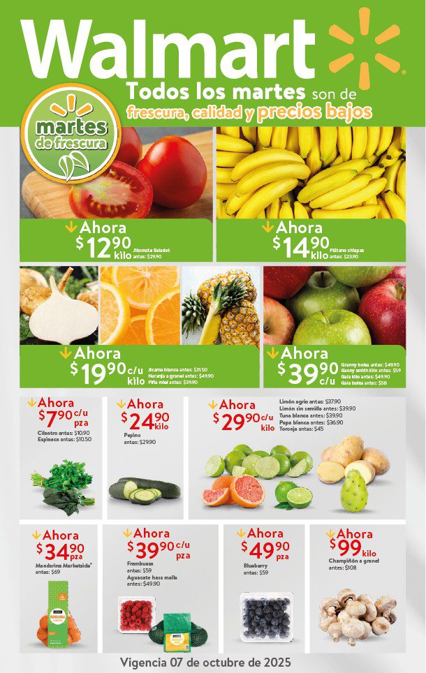 El Martes de Frescura Walmart para hoy 7 de octubre de 2025 tendrá las siguientes siguientes ofertas de frutas y verduras válidas en tiendas Walmart y también Walmart Express a nivel nacional.